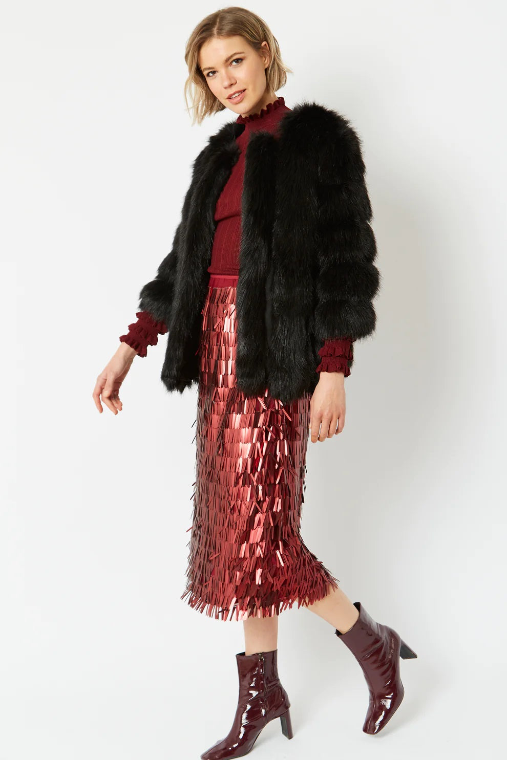 Stay warm and feel luxurious with this black faux fur coat! With a flattering neckline and cropped sleeves, you can pair it with either a casual day outfit or a dressier one for a night out. The coat is truly for any occasion!