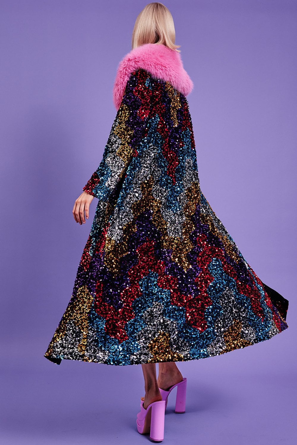 Black Sequin Velvet Trench Coat with Pink Faux Fur Collar